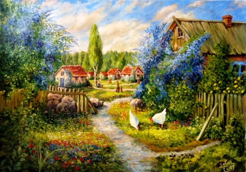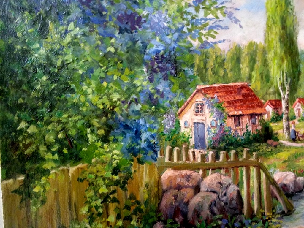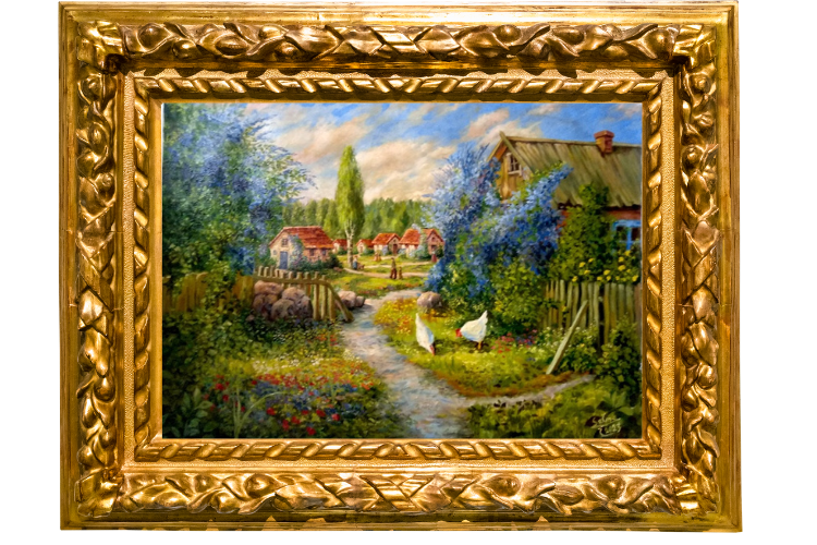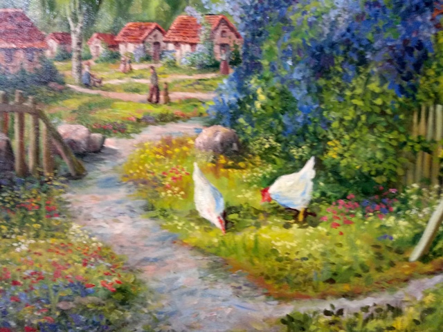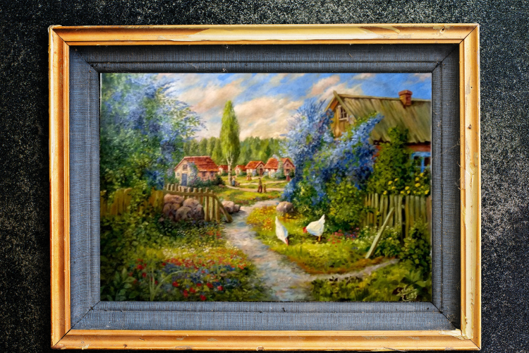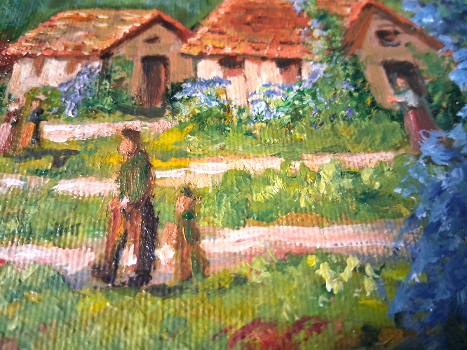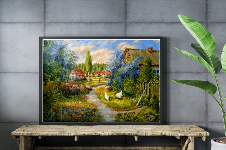 This original oil painting portrays a small village nestled within nature, capturing a sense of calm, simplicity, and harmony. The composition reflects a peaceful rural atmosphere, where natural surroundings and architectural elements blend softly. Inspired by classical landscape traditions, the artwork brings warmth and tranquility to any living space.