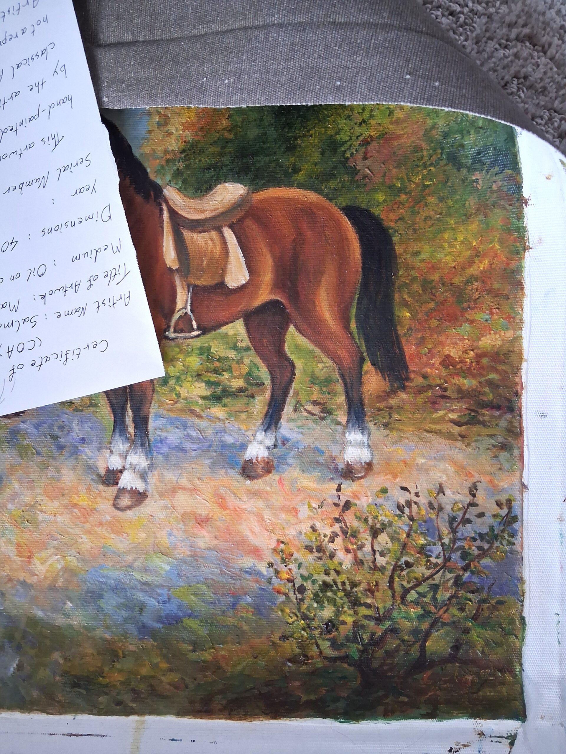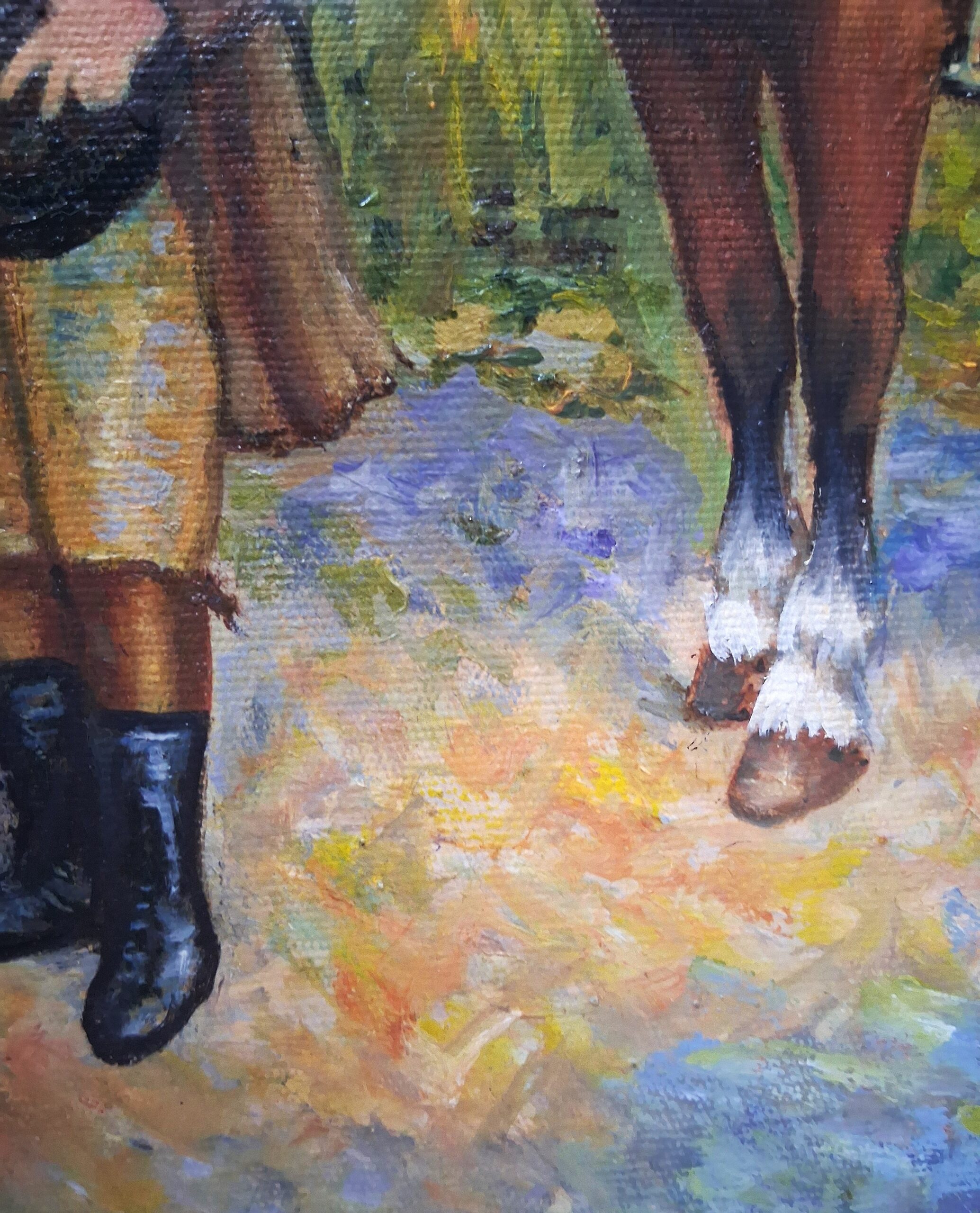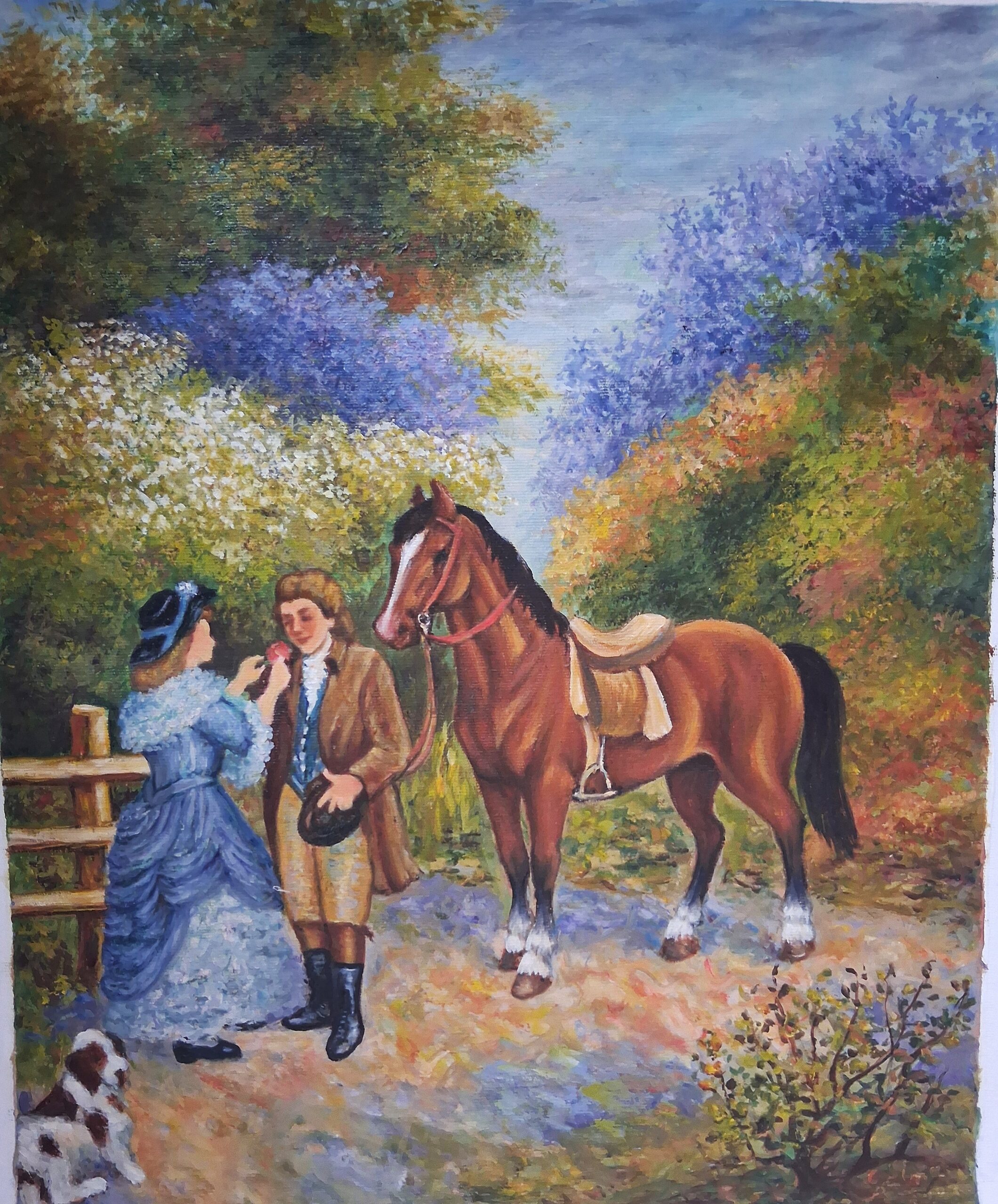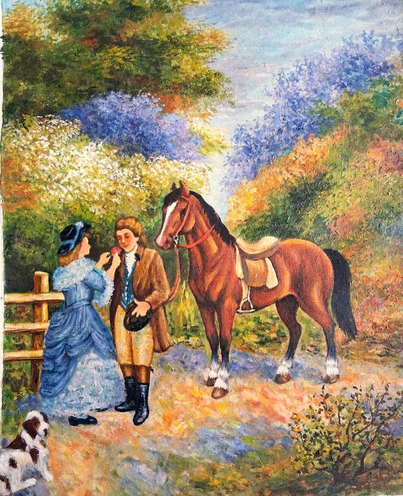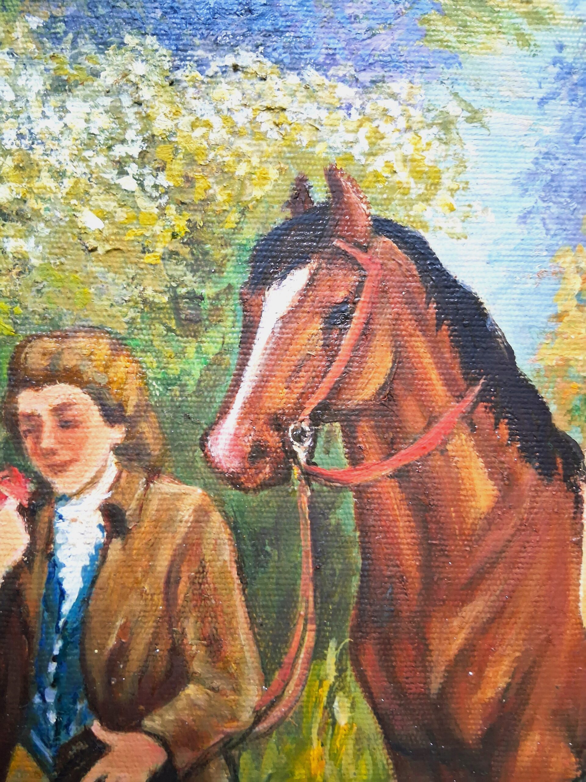 This original oil painting depicts a man, a woman, and a horse in a balanced and expressive composition. The artwork is inspired by classical American art, reflecting timeless themes of human presence, strength, and connection with nature. Rich oil textures and carefully controlled tones give the piece a refined and classic character, making it suitable for both modern and traditional interiors.